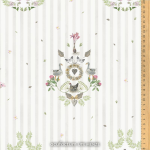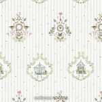 On a softly striped background, ornamental motis unfold, weaving together delicate plants, small garden houses and playful animals into a harmonious frame.